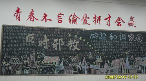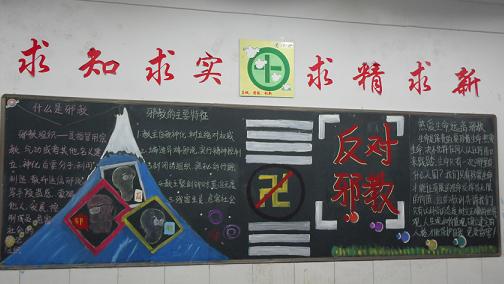 根據(jù)市教育局、市公安局的指示,我校保衛(wèi)科、團委在高一、高二年級 40 多個班級中開展了一場聲勢浩大的“校園拒絕邪教”主題黑板報宣傳活動。