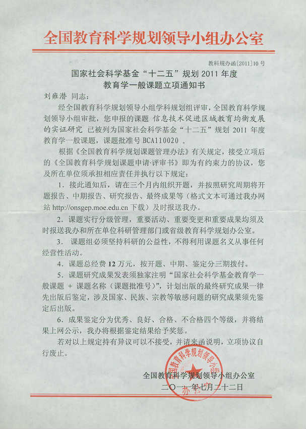 附: 由全國科學規(guī)劃領導小組辦公室批準的總課題立項通知書