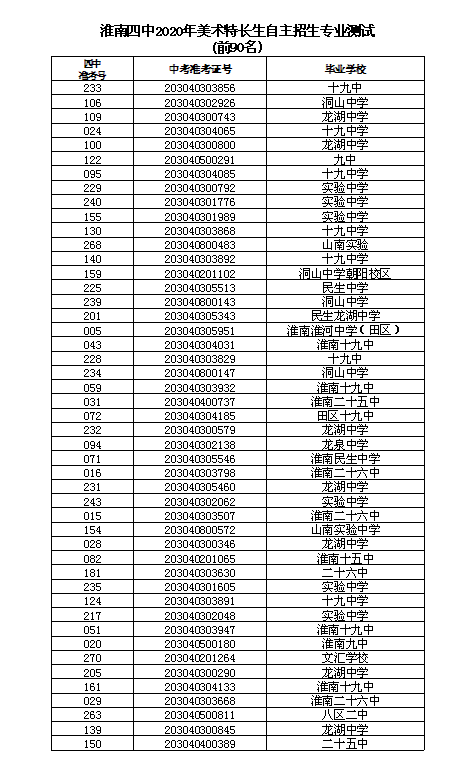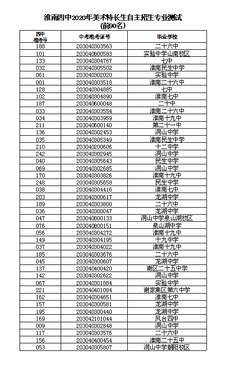 依據(jù)2020年淮南市教育體育局淮教體【2020】30號文件中“各校按照專業(yè)測試成績從高分到低分整理,按特長生自主招生計劃數(shù)2倍比例報送考生測試成績至市教育招生考試中心,由市教育招生考試中心將報考該校特長生自主招生考生,納入本校同一個批次提前錄取,先進行初中學業(yè)水平考試成績按百分制折算后,再按照初中學業(yè)水平考試成績20%、專項測試成績80%合成總分(專項測試成績不得低于專項測試總分值的60%),從高到低擇優(yōu)錄取,當考生總分成績相同時,則按專項測試成績從高到低順序依次錄取?!钡囊螅F(xiàn)對參加淮南四中2020年美術(shù)特長生招生考試的專業(yè)測試前90名同學予以公示(公示期一周)。市教育招生考試中心最終確定淮南四中最后錄取的45人名單并公布。