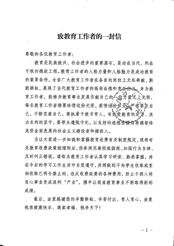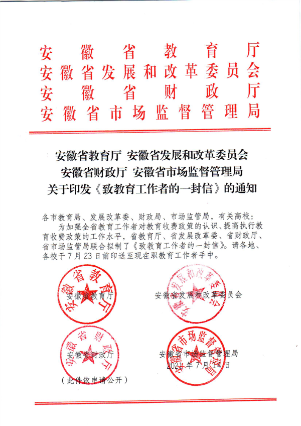 [轉(zhuǎn)] 安徽省教育廳 安徽省發(fā)展和改革委員會 安徽省財政廳 安徽省市場監(jiān)督管理局 關(guān)于印發(fā)《致教育工作者的一封信》的通知