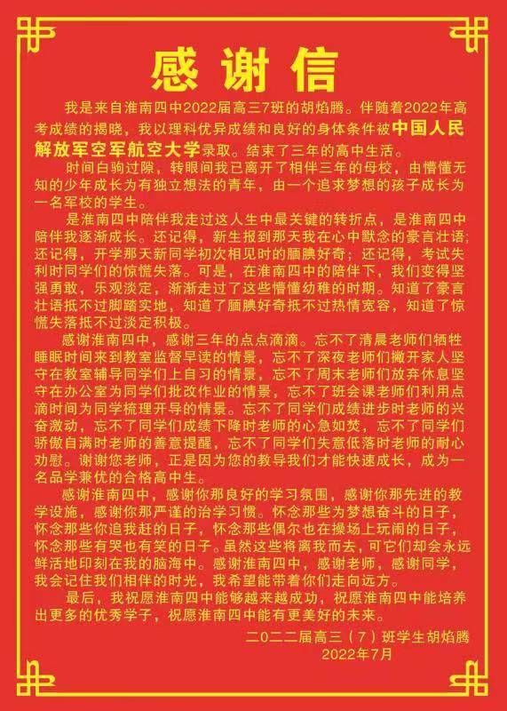 “在2022年高考成績?nèi)嫣嵘幕A(chǔ)上,2022屆高三7班胡焰騰同學(xué)以優(yōu)異的成績被中國人民解放軍空軍航空大學(xué)正式錄取?!?/span>