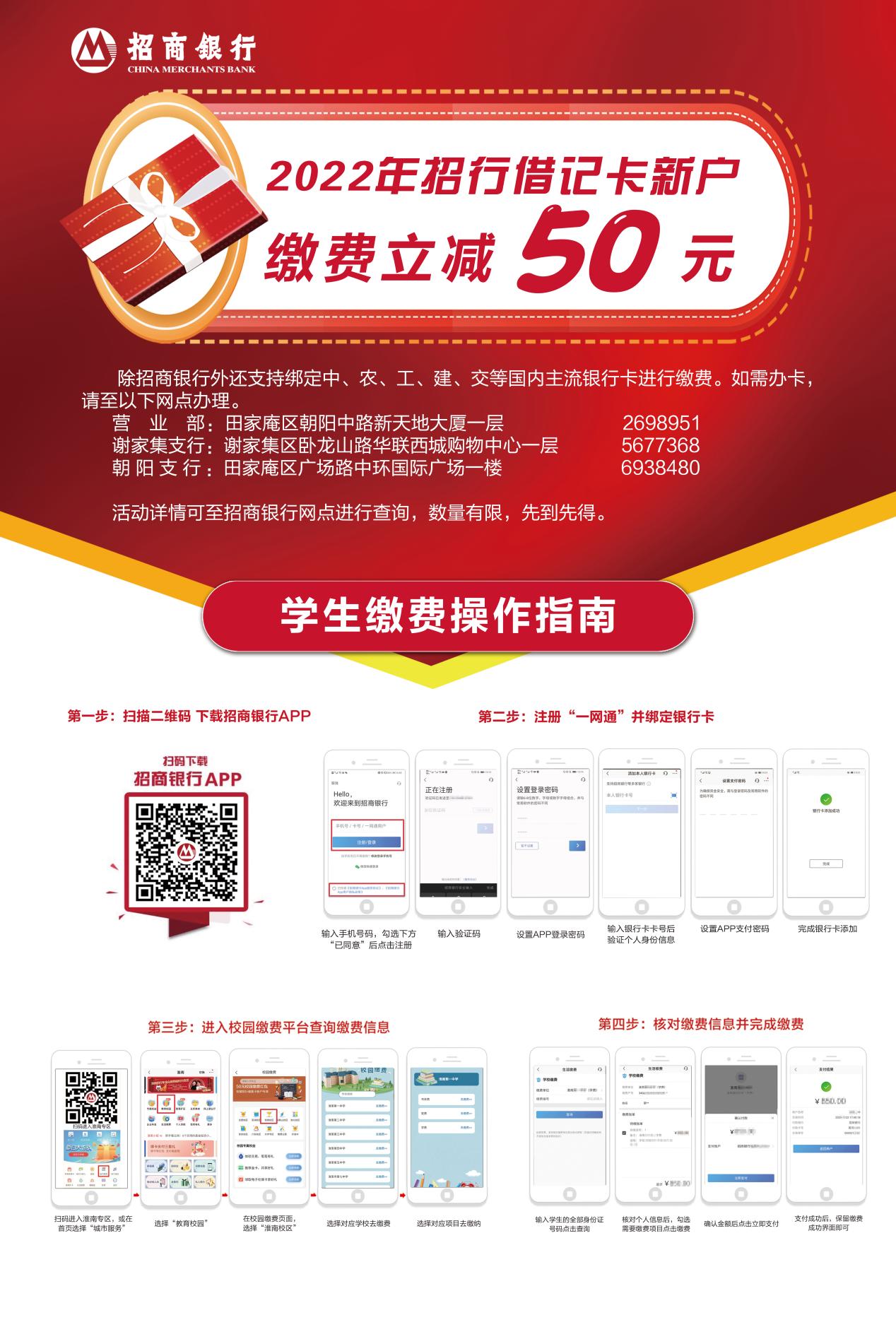 (3)如線上繳費未成功的,招商銀行工作人員現場協助辦理(家長攜帶本人身份證及銀行卡,卡內準備充足的繳費金額),或者到招商銀行網點辦理繳費手續(xù)(繳費編號為學生身份證號碼)。也可撥打操作流程中的網點電話或至招商銀行網點咨詢。