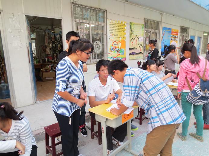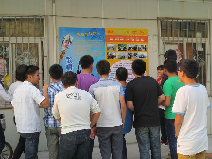 為繁榮校園文化,豐富校園生活,濃厚校園氣氛, 9 月 17 日下午淮南四中學(xué)生社團(tuán)開始了招新活動(dòng)。在一號(hào)教學(xué)樓前面十張桌子組成了一道亮麗的風(fēng)景線。同學(xué)們可以根據(jù)自己的興趣報(bào)名,招新的現(xiàn)場(chǎng)人山人海,熱鬧非凡。為了吸引更多的同學(xué)加入,各個(gè)社團(tuán)使出各種招數(shù),彰顯各自的亮點(diǎn)。