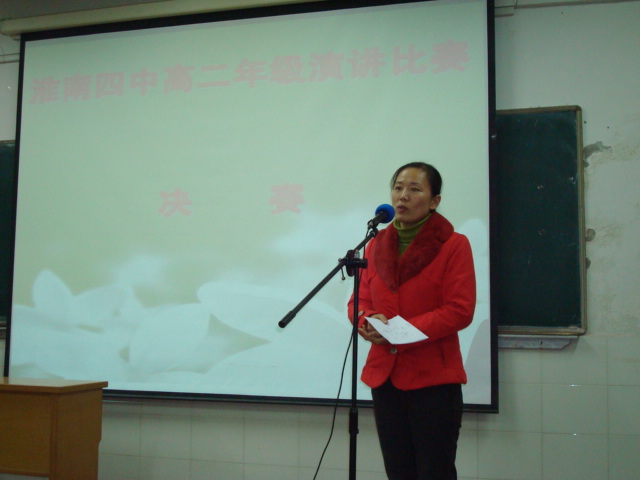 決賽現(xiàn)場,評委是來自高三的四位老師:(左起)豐賢淑 徐坤偉 班金鳳 佘根水