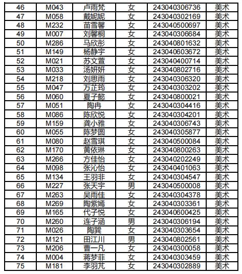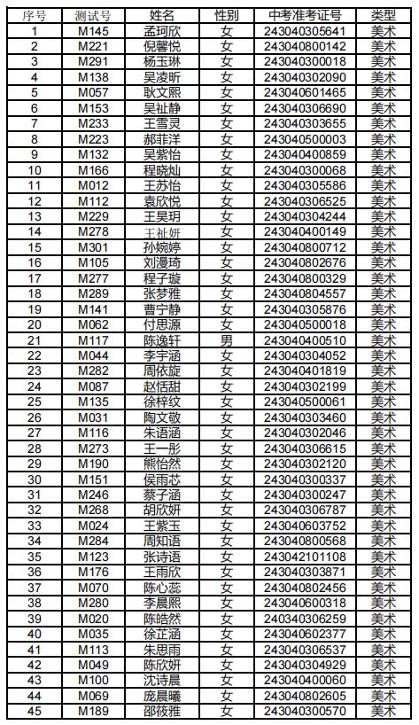 依據(jù)《淮南市教育體育局關(guān)于做好2024年普通中小學招生入學工作的通知》中“各校按照專業(yè)測試成績從高分到低分整理,按特長生自主招生計劃數(shù)1.5倍比例報送考生測試成績(百分制)”及“專項測試成績不得低于專項測試總分值的60%”的要求,現(xiàn)對參加美術(shù)專業(yè)測試入圍名單予以公示,公示時間為2024年6月24日至6月29日。