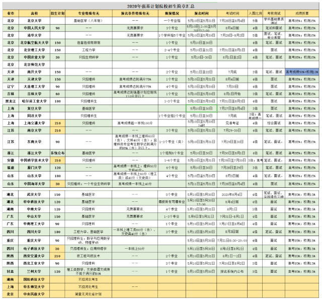 對(duì)此,根據(jù)簡(jiǎn)章進(jìn)行了匯總,以供家長(zhǎng)和考生方便查找和比較。整理了這35所學(xué)校2020年強(qiáng)基計(jì)劃的招生人數(shù)、??夹问健⑷雵壤?、校考占比、校考時(shí)間地點(diǎn)、報(bào)考條件等關(guān)鍵數(shù)據(jù),希望給面臨選擇的你一點(diǎn)啟發(fā)。