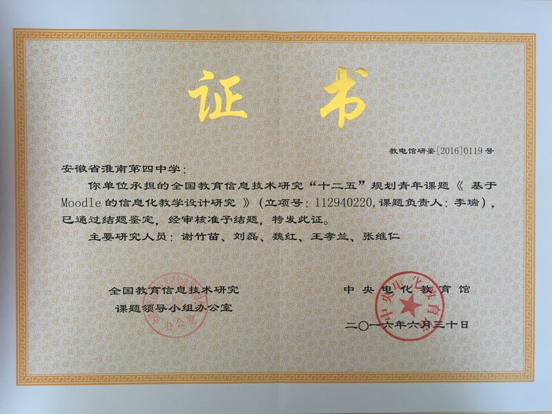 該課題(課題立項號 112940220 )于 2011 年 8 月被中央電化教育館正式確立立項,結(jié)題號“教電館研鑒 [2016]0119 號”,結(jié)題時間 2016 年 6 月 30 日。該課題探討了 Moodle 網(wǎng)絡(luò)教學平臺的功能體系,在構(gòu)建 Moodle 教學平臺的基礎(chǔ)上,探索了基于 Moodle 的信息技術(shù)課堂教學設(shè)計的基本原則和方法,并進行了教學實踐研究。該課題對高中信息技術(shù)學科及其它學科實施信息化教學提供理論和實踐上的借鑒,具有一定實踐意義。