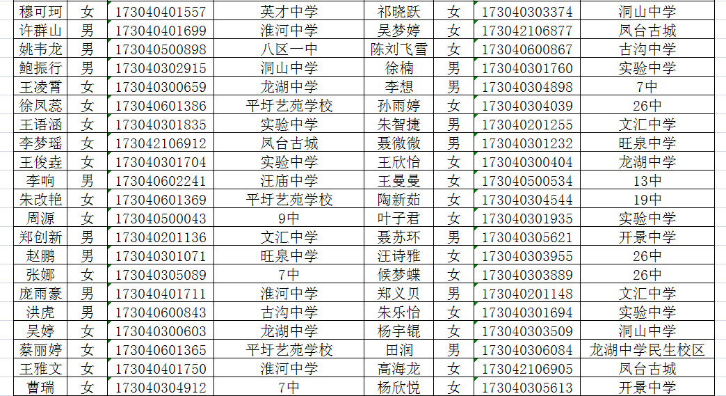 淮南四中自主招生(創(chuàng)新教育班)預錄取名單