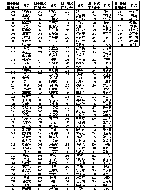 備注:以上同學(xué)美術(shù)專業(yè)測試入圍,后續(xù)錄取中招辦將按照 中考成績按百分制折算后,按照中考成績 20 %、美術(shù)測試成績 80 %合成總分,從高到低擇優(yōu)錄取, 當(dāng)考生總分成績相同時,則按照美術(shù)專業(yè)測試成績從高到低依次預(yù)錄取 45 人,錄取名單將在本網(wǎng)站公布。具體成績請下周一上午到淮南四中教務(wù)處查詢。