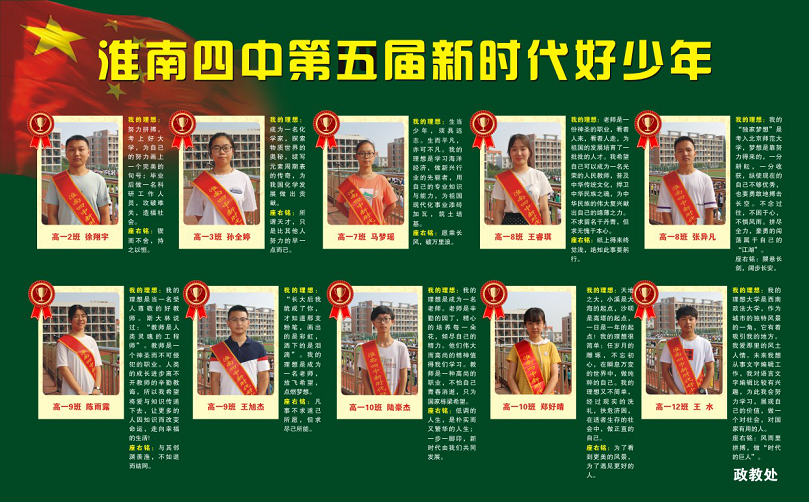 為深入貫徹落實(shí)《中共中央國務(wù)院關(guān)于進(jìn)一步加強(qiáng)和改進(jìn)未成年人思想道德建設(shè)的若干意見》(中發(fā) [2004]8號)精神,充分發(fā)揮典型育人的作用,引導(dǎo)我校學(xué)生成長為中國特色社會(huì)主義事業(yè)的合格建設(shè)者和可靠接班人,我校于201 9 年 5 月 ―201 9 年 6 月進(jìn)行了 “淮南四中 新時(shí)代好少年 ”評選,經(jīng)班級推薦、級部選拔、學(xué)校綜合考核, 評出好男生、好女生共十位。并在新學(xué)期第一次升旗儀式上進(jìn)行表彰。