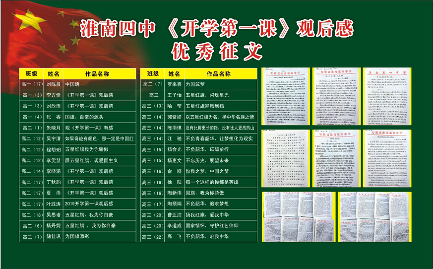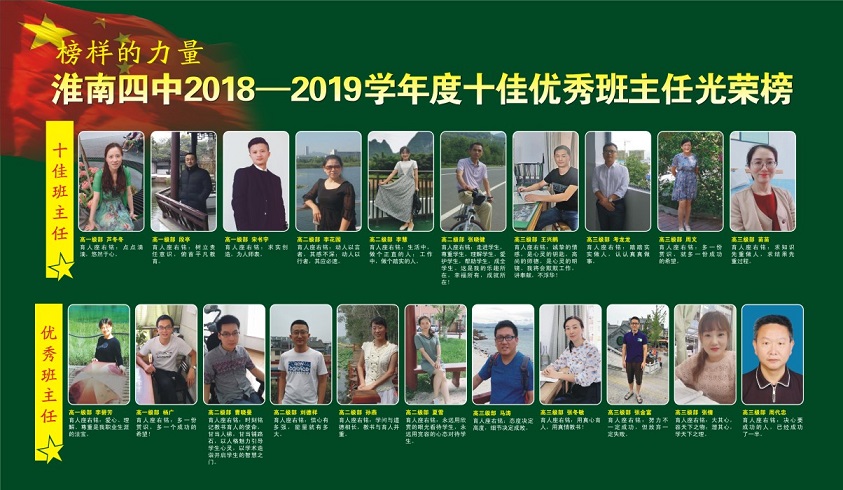 結(jié)合 “不忘初心、牢記使命”主題教育,開展“ 身邊的榜樣 ”學(xué)習(xí)宣傳活動(dòng), 我新學(xué)期第一個(gè)升旗儀式上對淮南四中第五屆新時(shí)代好少年進(jìn)行表彰,在新學(xué)期的 2019班主任論壇上對2018-2019學(xué)年度的“十佳”“優(yōu)秀”班主任進(jìn)行表彰。并將“十佳”“優(yōu)秀”班主任的照片在宣傳欄展出, 充分發(fā)揮先進(jìn)典型的精神引領(lǐng)和示范作用。